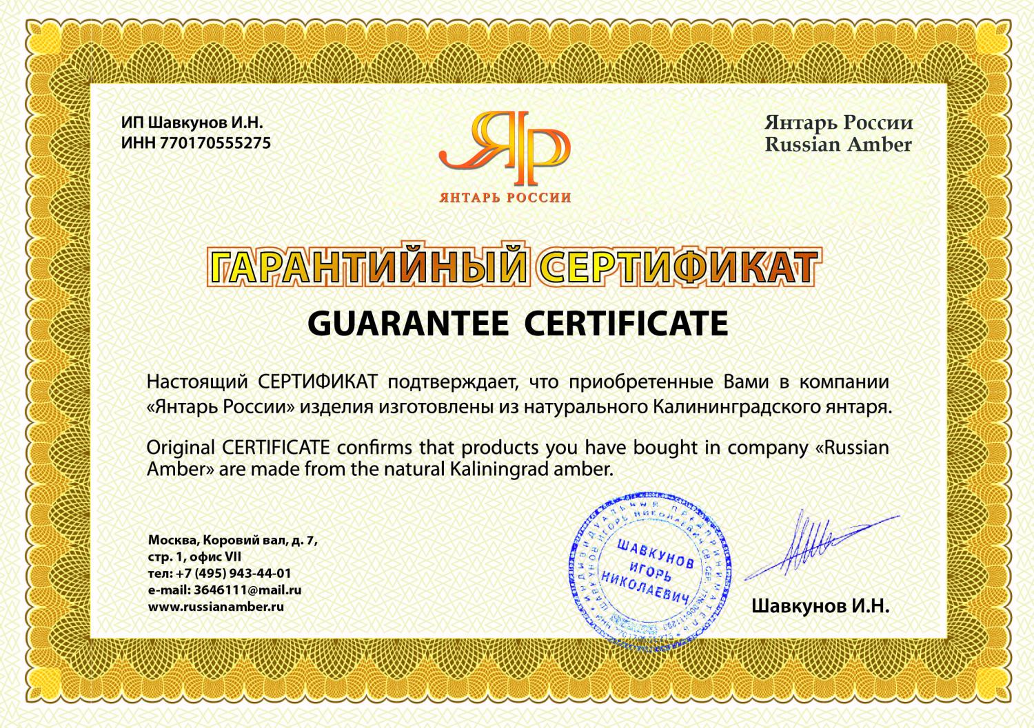 Гарантия подлинности Натуральный балтийский янтарь с сертификатом